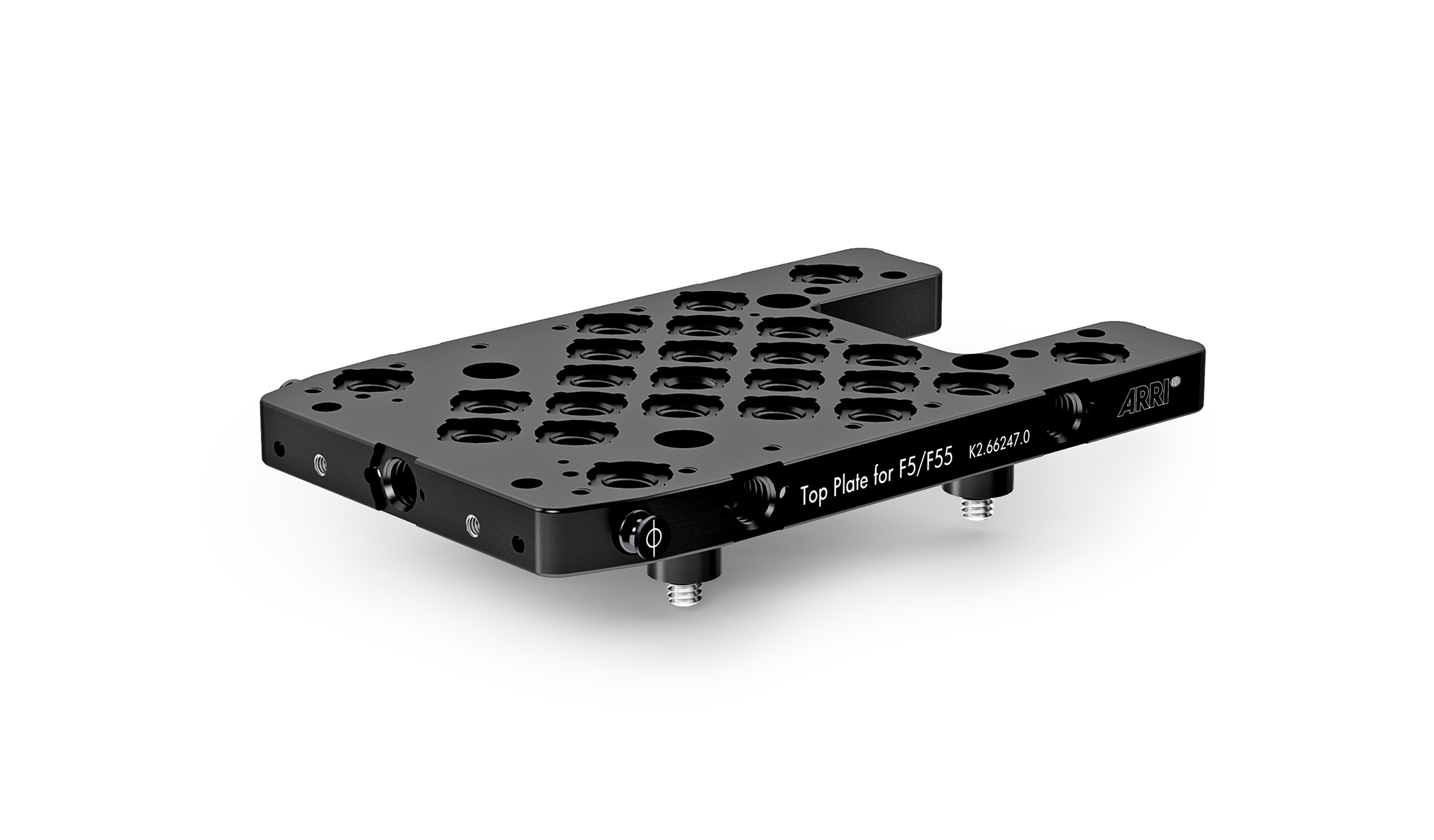 The top plate for Sony F5 and F55 cameras is designed to offer multiple mounting interfaces for accessories. An ARRI handle can be attached at three different positions to optimize balance, although the original Sony handle remains compatible. With its multiple centered interfaces, the top plate can also be used as a low mode plate for Steadicam shots. An optional 15 mm lightweight support rod adapter can be attached to the front of the plate, optically centered to the camera.