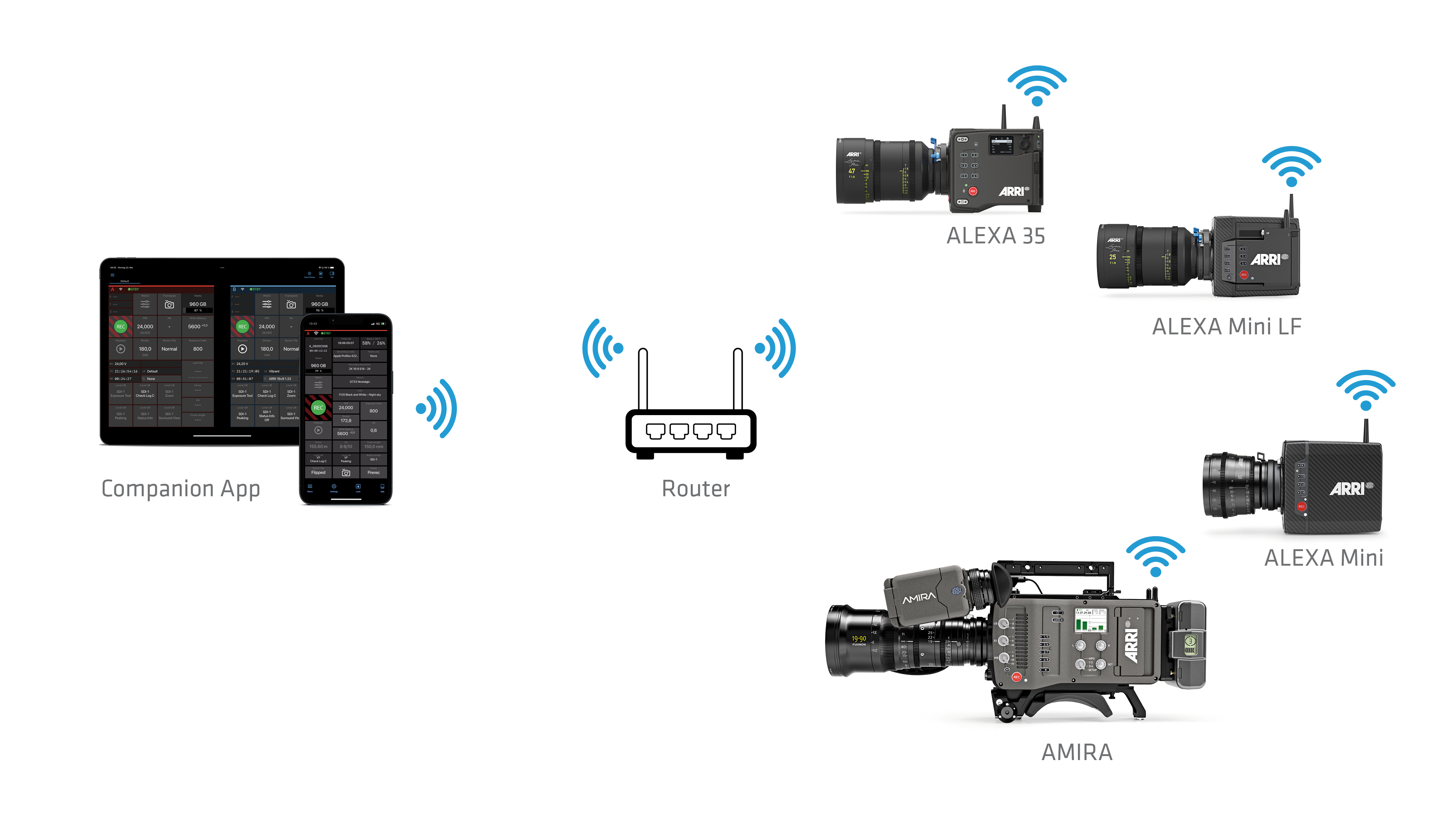 Smaller productions, owner operators, or specialists such as drone companies may opt for a direct network where the cameras act as network hosts. Many other productions, however, will want to establish a set network where all the cameras being used on set are connected wirelessly to a router and act as network clients. In this type of interconnected multi-camera environment, the Camera Companion App is an indispensable and time-saving tool.