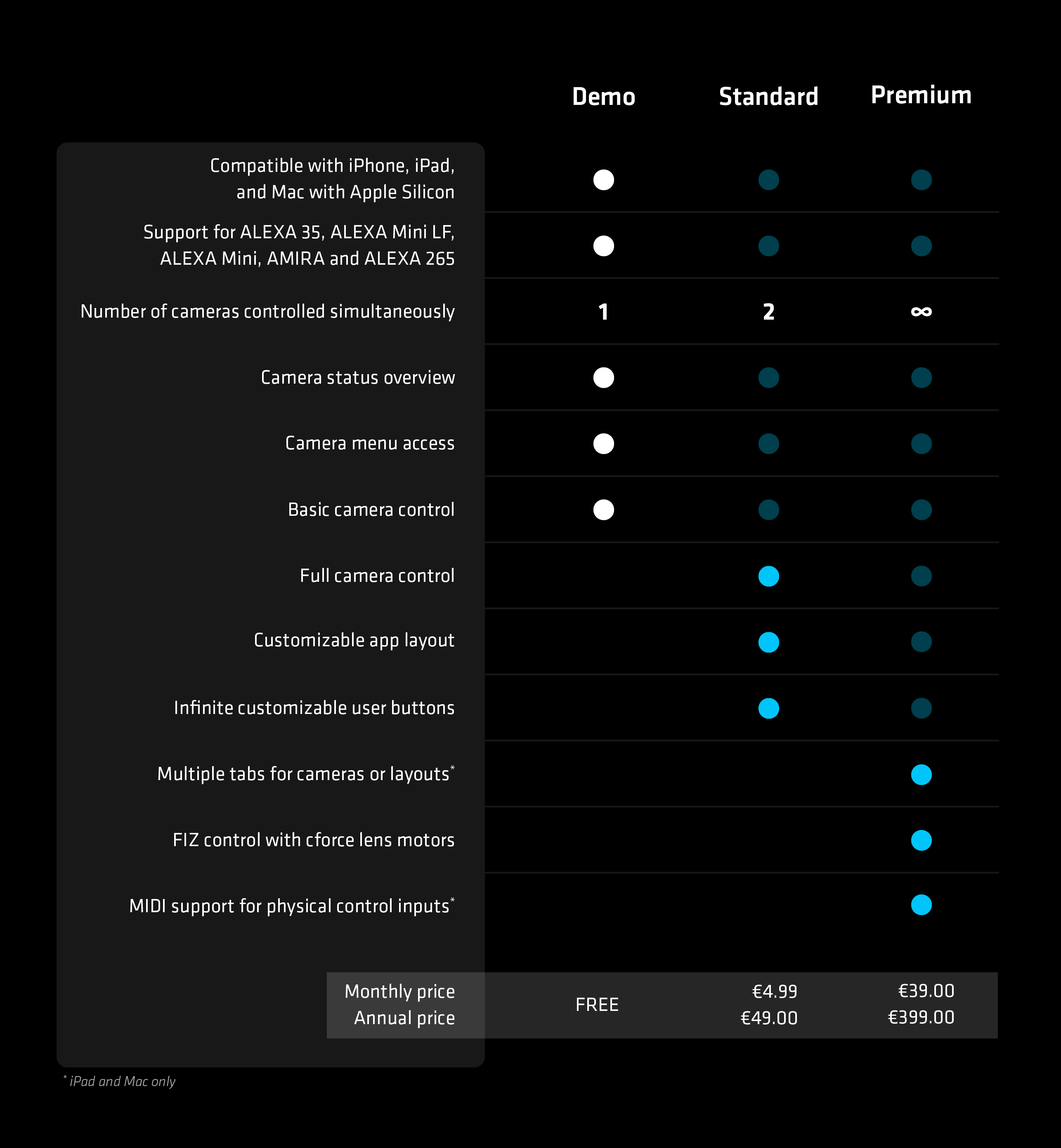 Camera Companion is available as a Standard subscription for comprehensive camera control and a Premium subscription for more than two cameras and extra features like MIDI support via physical control devices. Learn more and access free trials in the subscription menu.