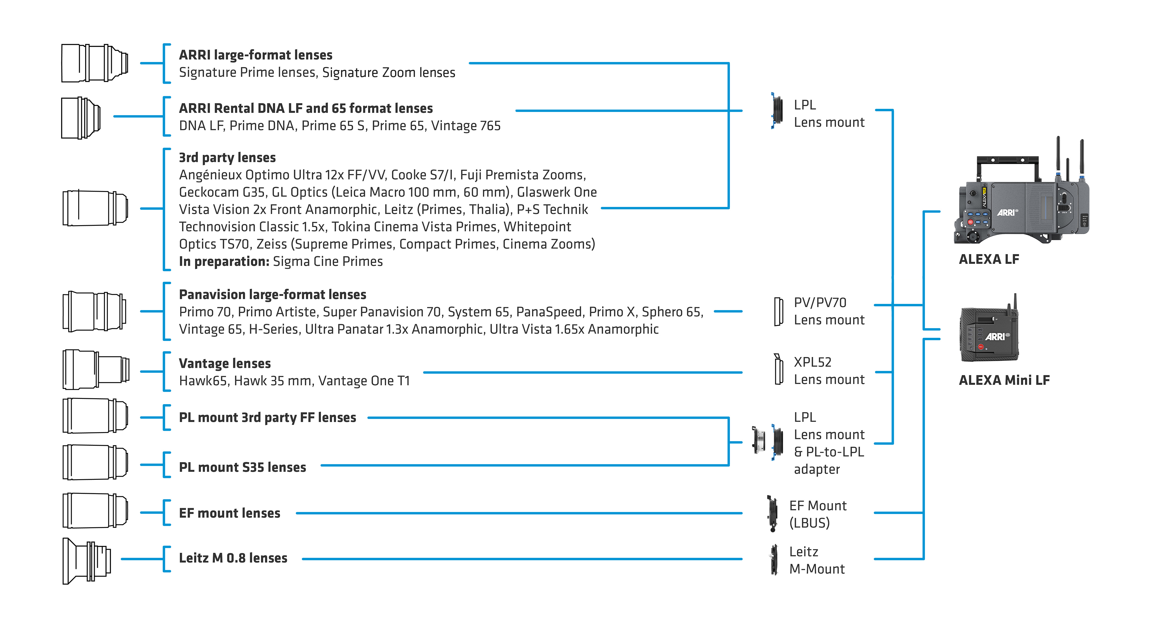 The LPL mount can accommodate all common digital sensor sizes, from ALEXA Mini to ALEXA 65, and allows for the design of smaller, lighter, and faster lenses with enhanced optical properties. Any lens can be used on any camera, as the lens mount will never interfere with sensor coverage.
