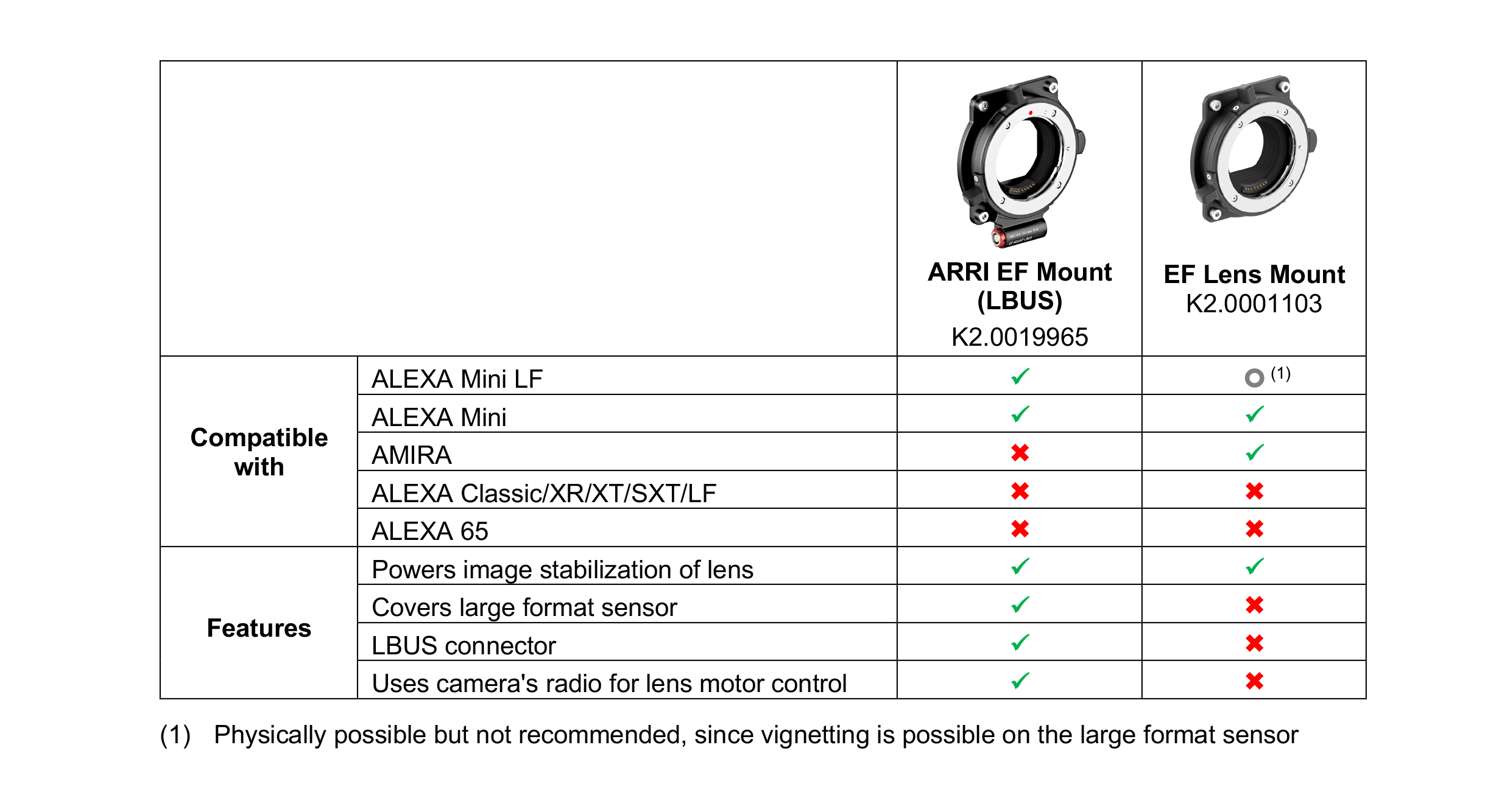 • The EF Lens Mount (K2.0001103) was designed for Super  35 only. While it could be attached to the ALEXA  Mini LF, large format lenses may vignette. We recommend using the new ARRI EF Mount (LBUS) (K2.0019965) on the ALEXA Mini LF, which also supports the use of lens motors and LBUS devices.
