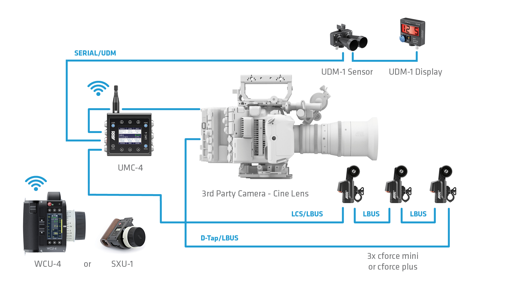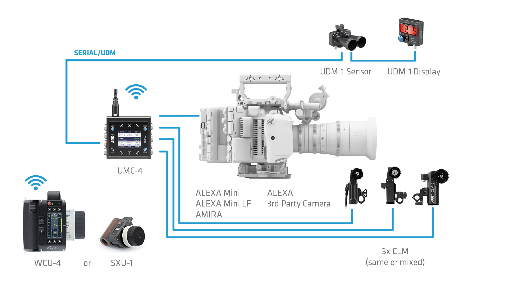 • System Integration: The UDM‑1 comes with a sensor module and a display unit that indicates the measured values on a transflective screen. When used with ALEXA Mini, ALEXA Mini LF, cforce mini RF, AMC-1 in combination with the LCUBE CUB-1, ALEXA 35, ALEXA Plus or Studio cameras or the Universal Motor Controller UMC-4 as well as the Radio Interface Adapter RIA‑1, the measured distance will be instantly displayed on the Hi‑5 or WCU‑4 hand unit. The UDM‑1 also enables ALEXA Plus or Studio cameras and the RIA‑1 / UMC-4 to do focus tracking – setting the focus motor to continuously follow measured distance of a subject in the frame.