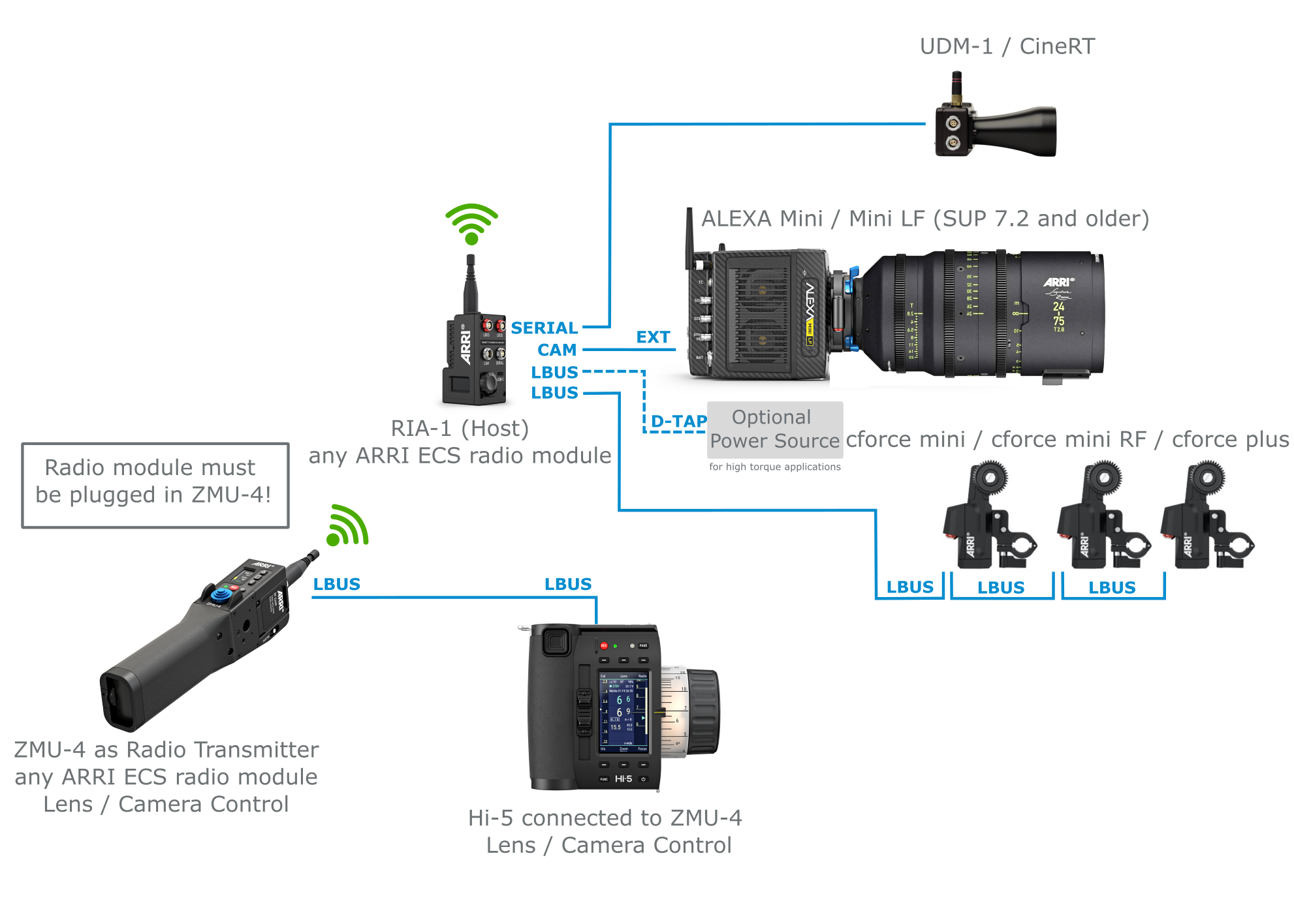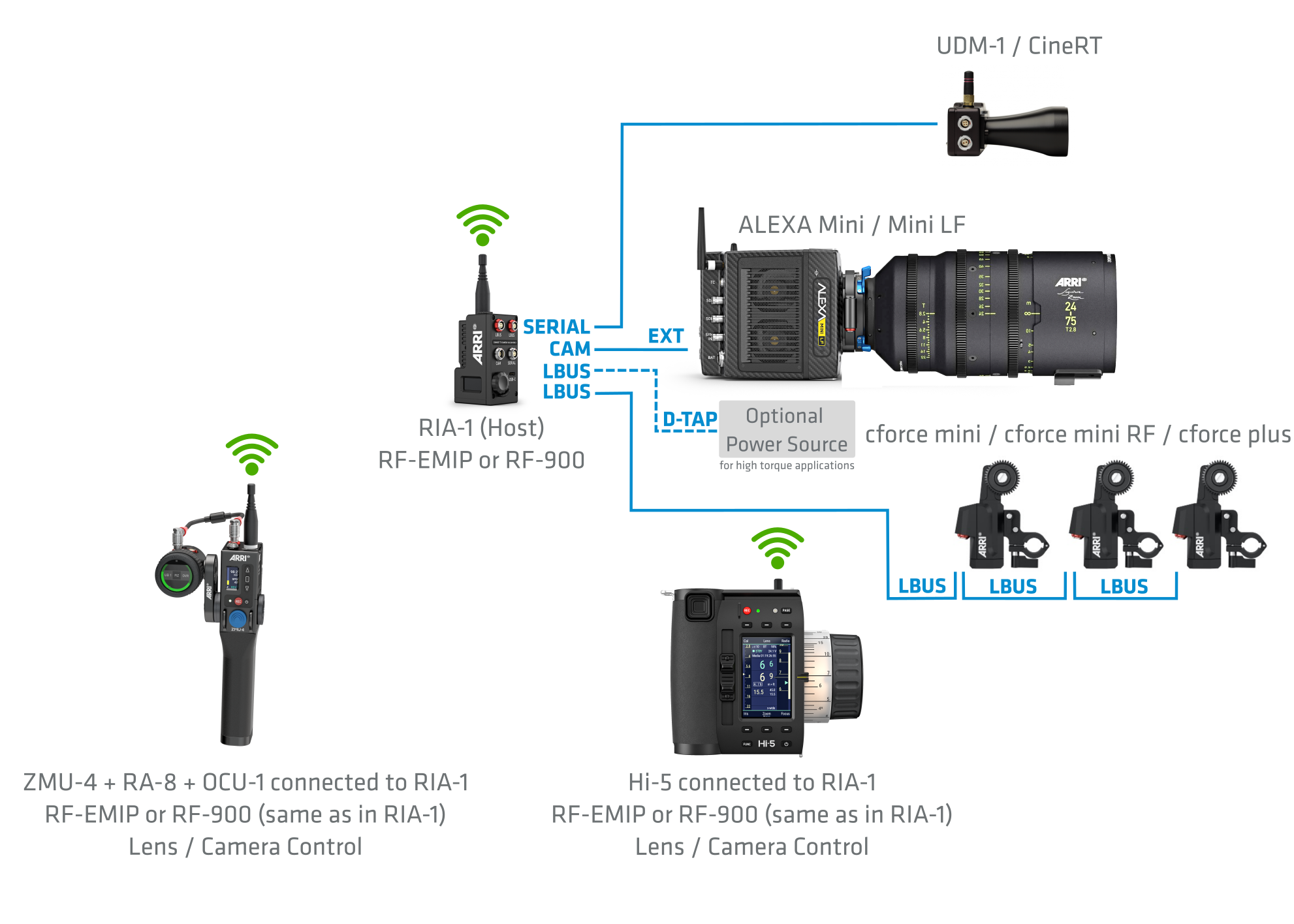 ZMU‑4 + OCU‑1 as 2-axis controller and Hi‑5 wirelessly connected to a RIA‑1 for ALEXA Mini / Mini LF lens and camera control