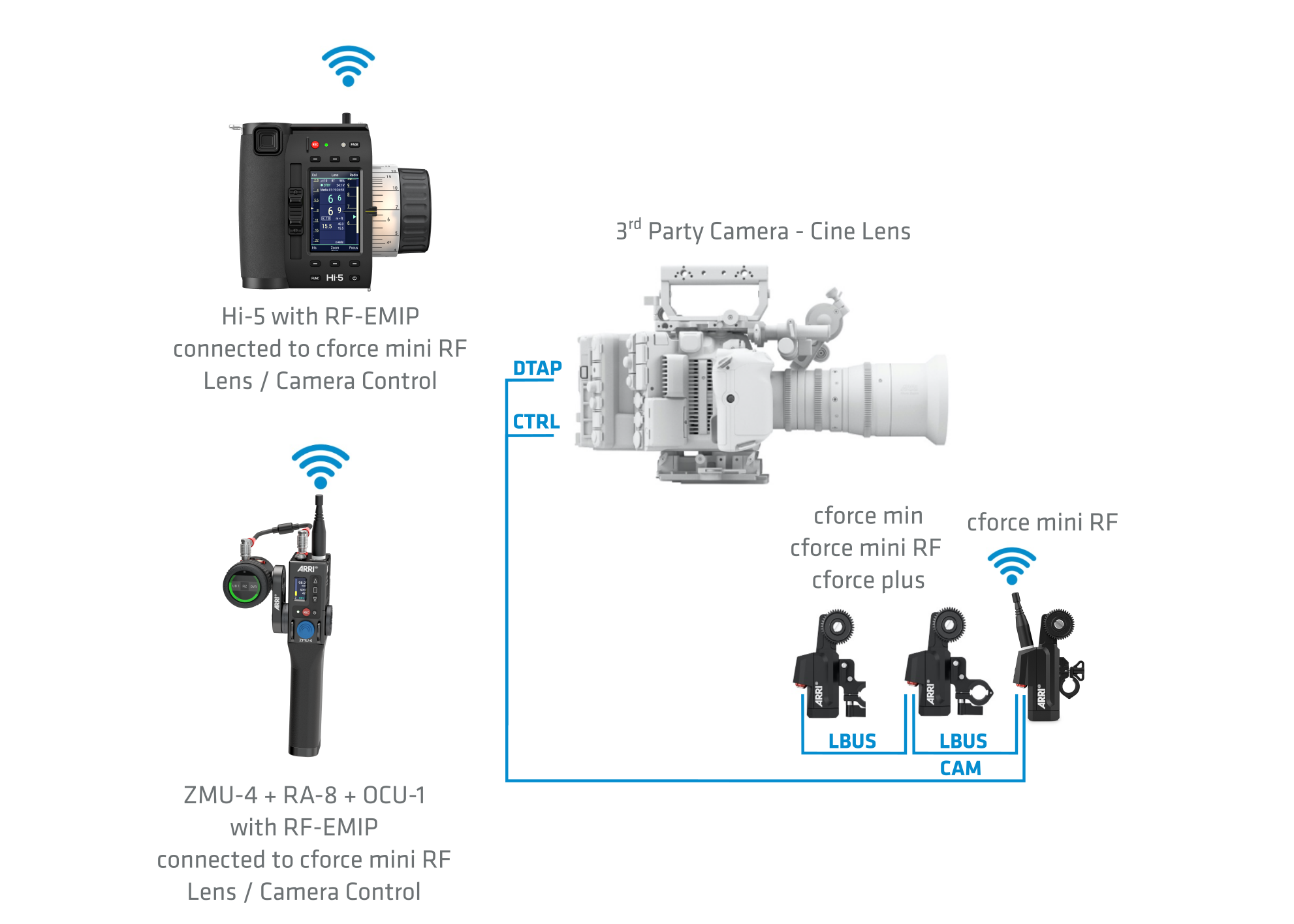 ZMU‑4 + OCU‑1 as 2-axis controller and Hi‑5 wirelessly connected to cforce mini RF for 3rd Party lens and camera control