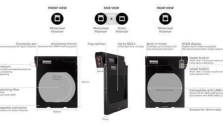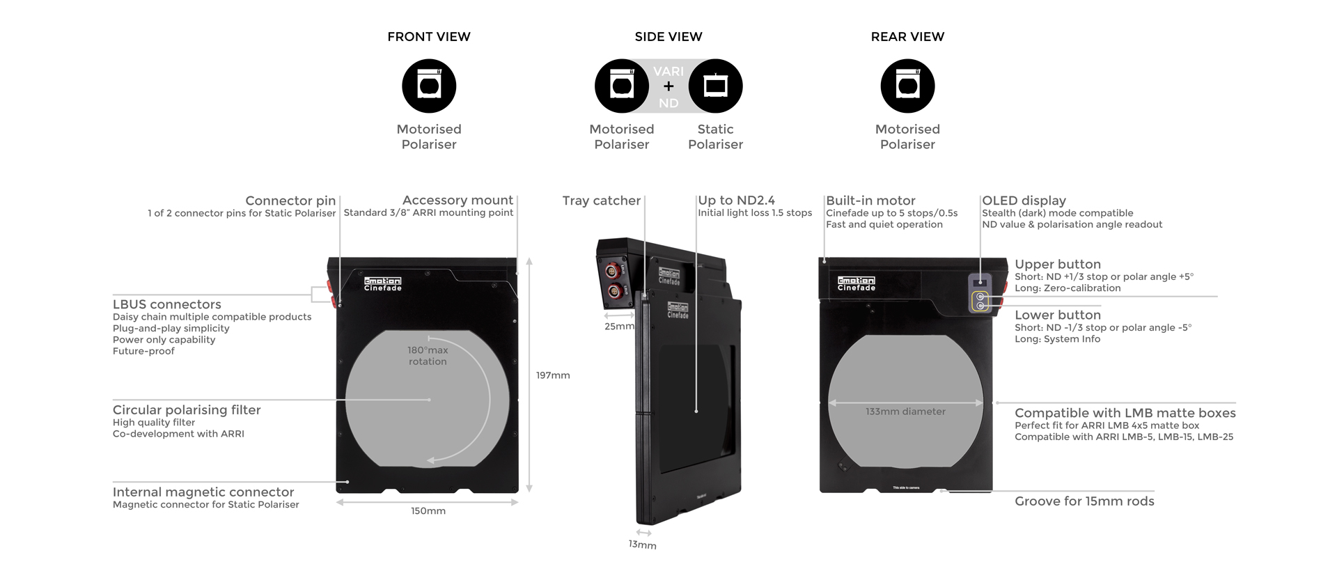 All ARRI LMB matte boxes are compatible and the cmotion Cinefade VariND takes up two filter slots in VariND mode and one filter slot in RotaPola mode.