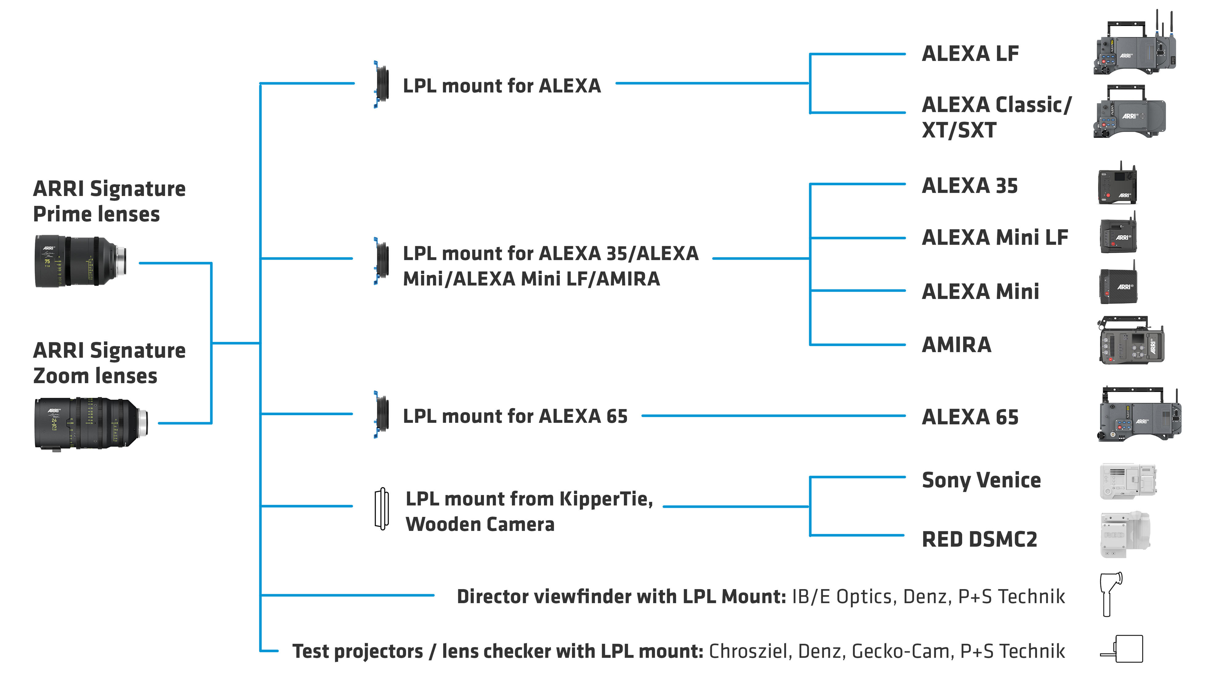 ARRI has shared LPL specifications openly and free-of-charge across the industry, establishing the LPL lens mount as a standard interface between cameras and lenses. ARRI LPL lens mounts are available for ALEXA 65, ALEXA 35, ALEXA LF, ALEXA Mini LF, ALEXA Classic/XT/SXT, ALEXA Mini and AMIRA cameras. In addition, third parties offer LPL lens mounts for cameras, director's viewfinders, and lens testing tools, so ARRI Signatures and other LPL lenses can be universally used.