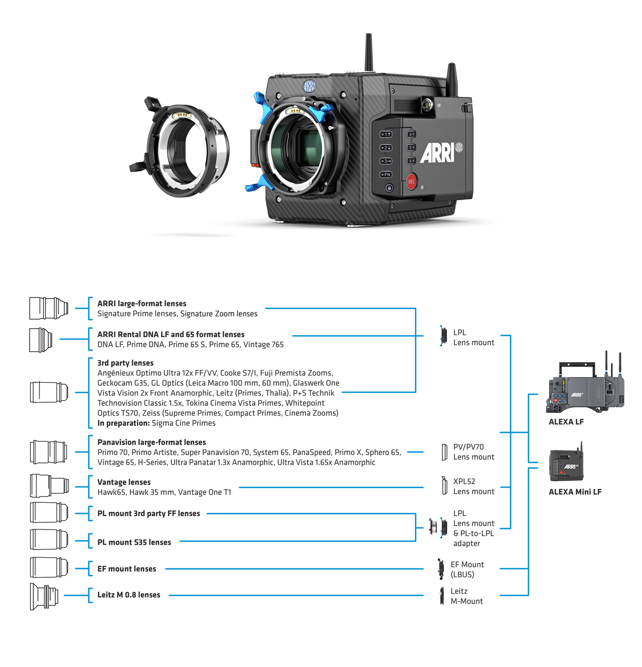 • The ARRI LPL Mount (LBUS) (that is attached to the ALEXA  Mini LF in the image below) is the ideal mount for all LPL lenses, and with the PL-to-LPL Adapter (floating in front of the camera in the image below) it can also accept all PL mount lenses, be they Super  35 or large format. The ARRI LPL Mount (LBUS) supports LDS-2 and /i lens metadata, and the PL-to-LPL Adapter supports LDS-1 and /i.