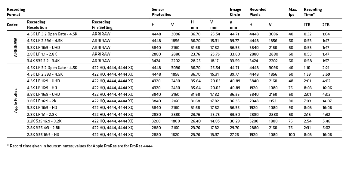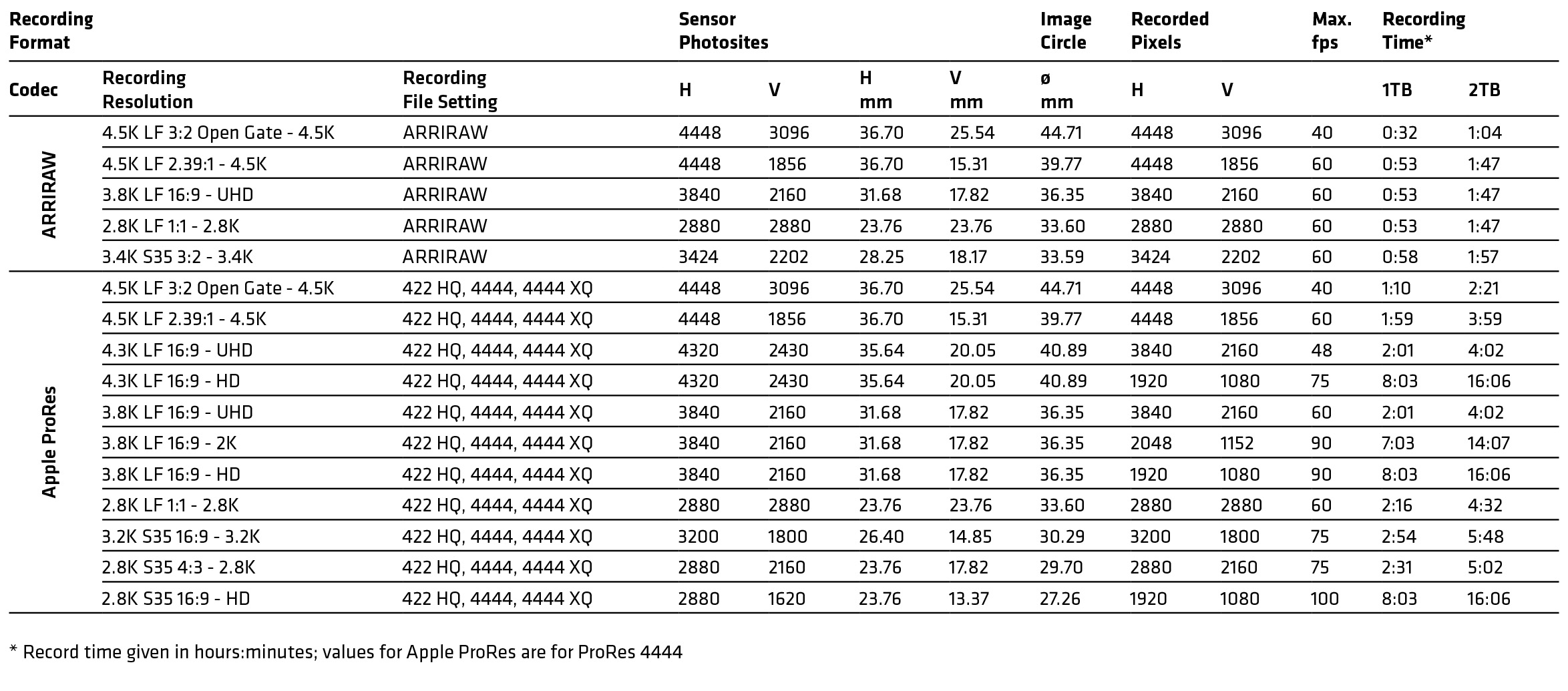 • Please see the table below. To get more information, please use the ARRI Formats and Data Rate Calculator.