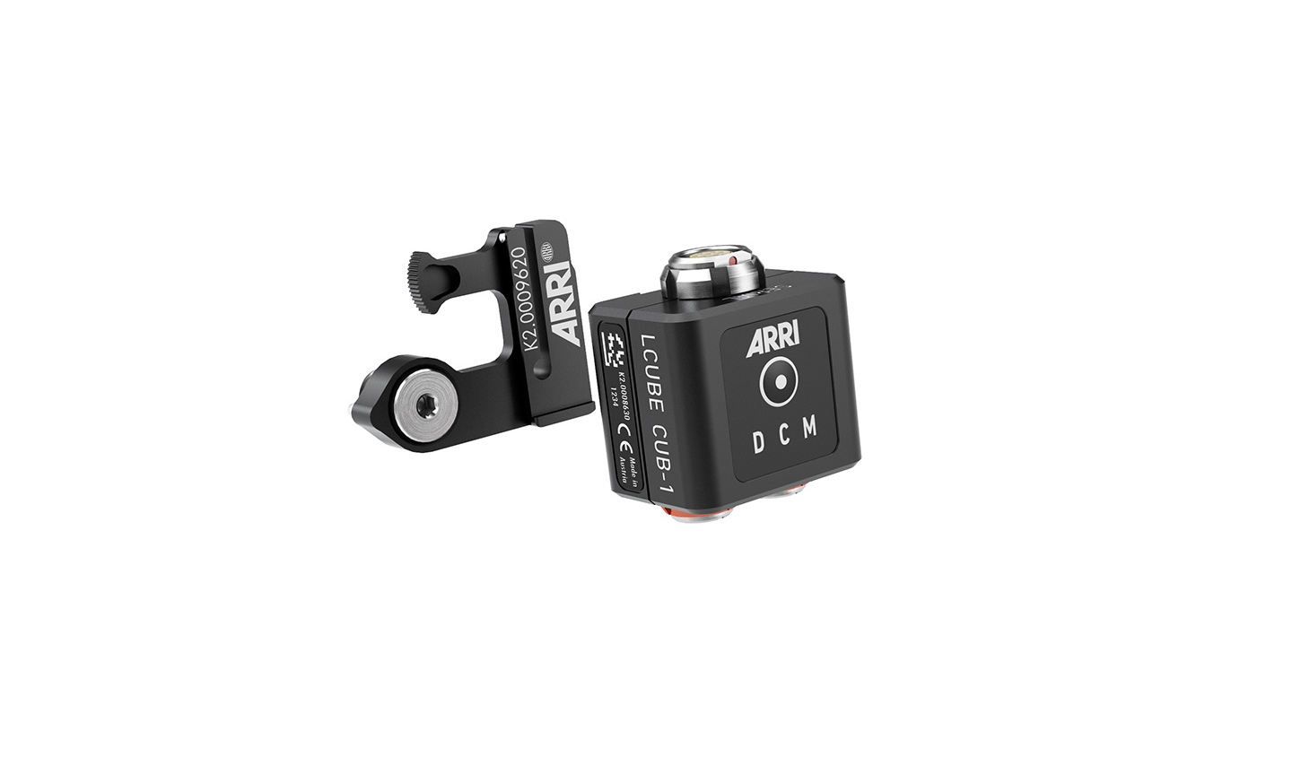 • Connect the LBUS connector of the ALEXA Mini LF to the LCUBE CUB-1 with an LBUS to LBUS cable, and the CUB-1 to the UDM‑1 (Ultrasonic Distance Measure) with an SERIAL to UDM cable. The CUB-1 (pictured below with attachment bracket) is a miniature converter box converting the LBUS protocol to serial protocols and vice versa.