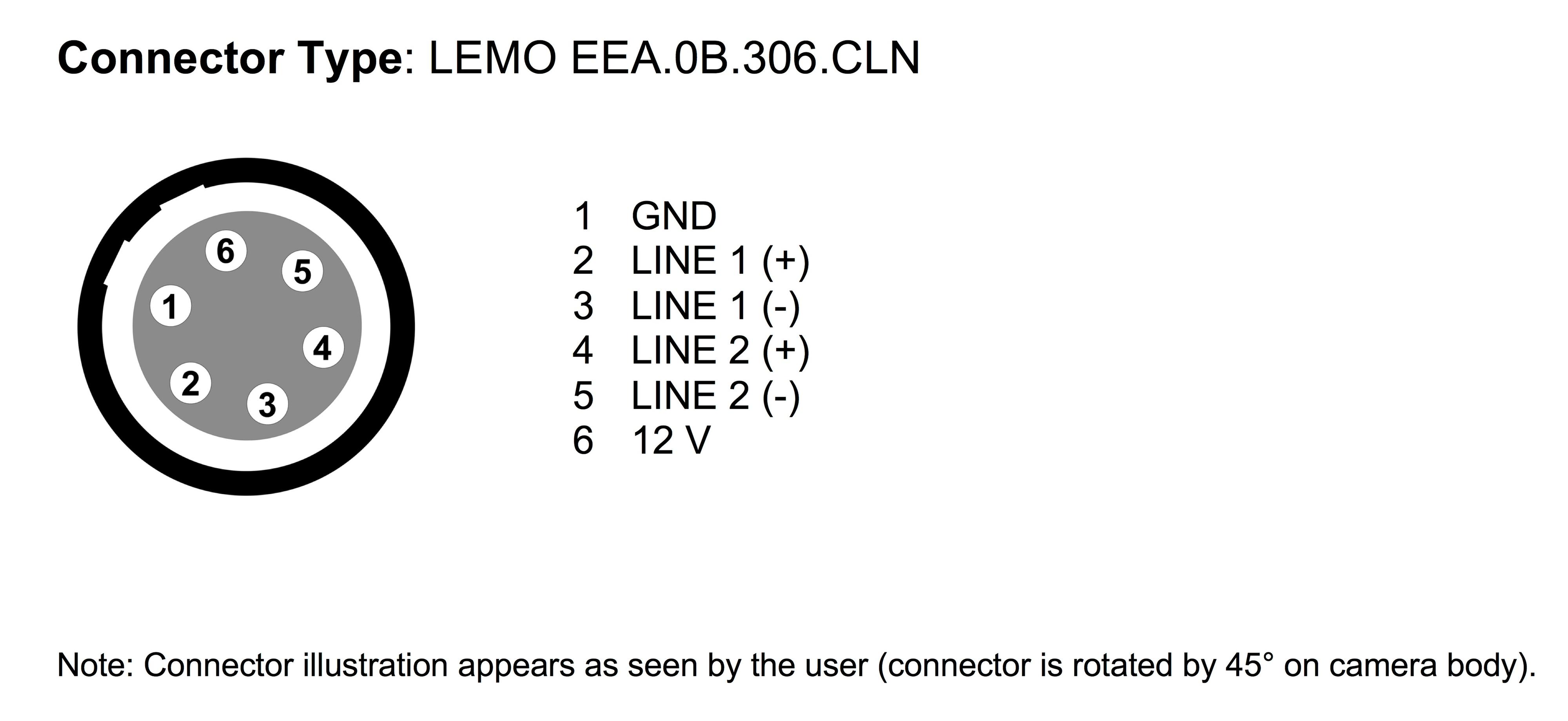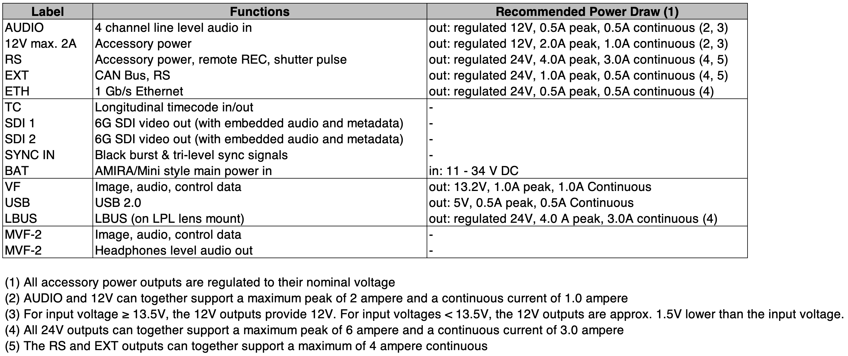• The ALEXA Mini LF has a 6-pin AUDIO connector, that is one pin more than the ALEXA Mini AUDIO connector. This allows the Mini LF AUDIO connector to provide 12V accessory power to external pre-amplifiers or wireless audio receivers. Those accessories can now use just one cable to transport audio and power, leaving the other accessory power outputs on the camera available for other uses.