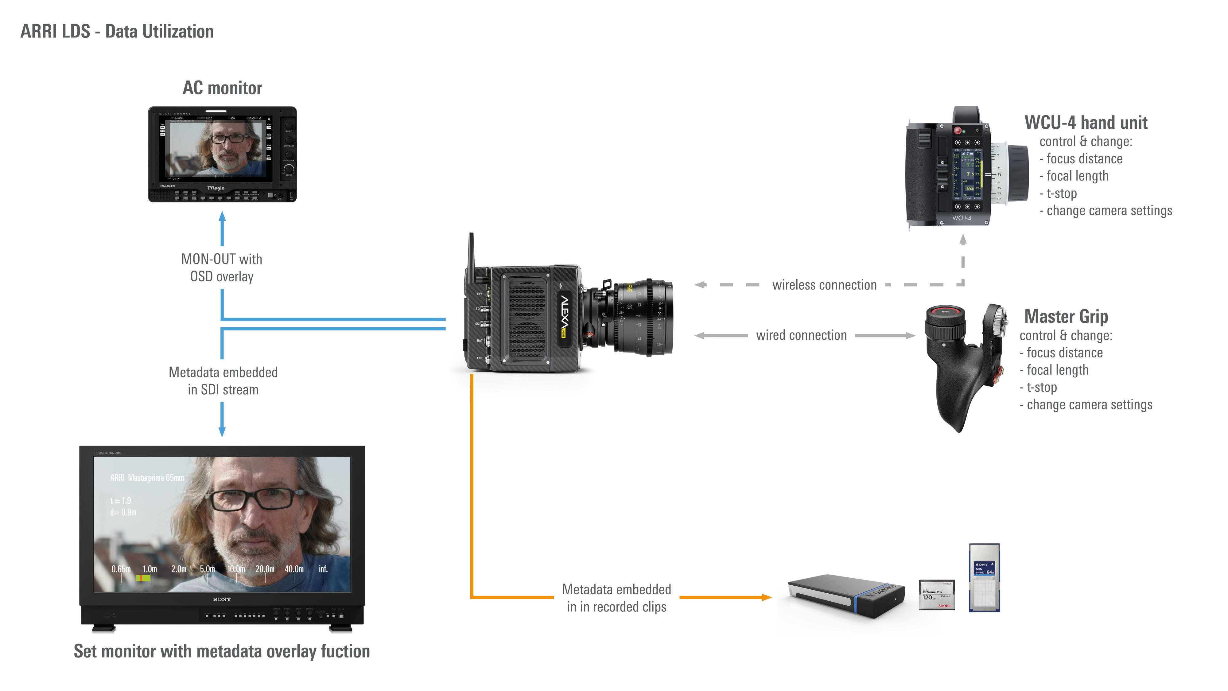 The Lens Data System (LDS) provides various time and money saving features by displaying lens data and camera related information on our WCU hand unit, in status overlays in-camera or on connected monitors/video assist for easy communication. In addition it brings additional benefits in post-production: all the lens data is being carried through the pipeline and embedded in the original camera negative files for use in VFX.