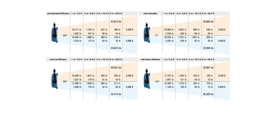 | with Lite Diffusion (105°) | 3.200 K: 659 lux / 61 fc 5.600 K: 684 lux / 64 fc |