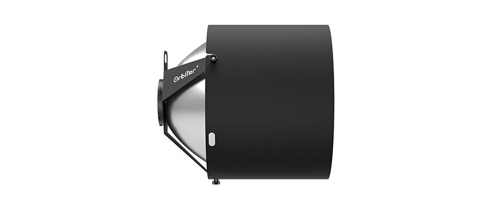 The two elements of the optic, the reflector and snoot, can be easily separated and stacked for convenient storage and transport. The Orbiter Beam comprises a unique manual hot-spot adjustment allowing variation from hard to soft edge light. No additional accessories for the Orbiter Beam optic such as barndoors or snoots are required as the light beam produced is already nicely focused.