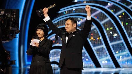 Director Ryusuke Hamaguchi (right) accepts the Oscar® for International Feature.