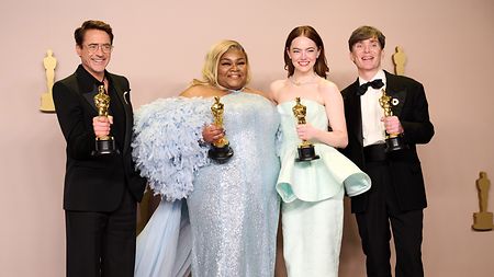Robert Downey Jr., Da'Vine Joy Randolph, Emma Stone, and Cillian Murphy pose backstage with the Oscar for Actor/Actress in a Supporting Role and the Oscar for Actor/Actress in a Leading Role