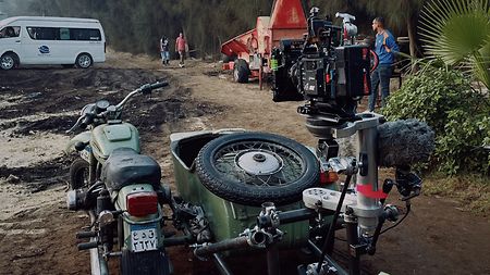 The ALEXA 35 rigged onto a motorcycle sidecar where Rambo sits on their rides around Cairo