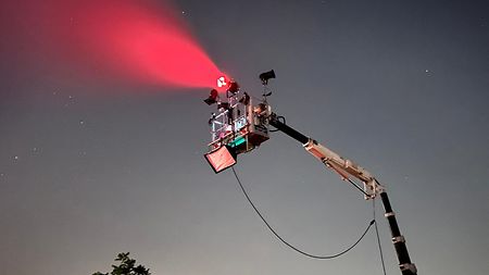 There is a dream scene in the film, a kind of vision of a memory that Colapesce has after ingesting a hallucinogen. It was originally supposed to be shot in black and white to be clearly detached from the rest of the film, which is quite colorful. But then Zavvo and the two protagonists were sorry to lose the color component. I then proposed to do the scene in red and black, with predominantly red light everywhere. In the sequence he takes the hallucinogen in one place, falls asleep, and wakes up in the same place, but at that point there is no one there. We're in the middle of nature, he's bathed in red light, and the camera follows him through a series of situations linked together by a dolly or whip pan: You see him as a child, him with his dad, him with his ex-girlfriends, him at school with nuns. For this scene, the Orbiter was crucial: It was always the main light that created the cone of light on the actor, and around Orbiter, positioned on a crane that went up to about thirty meters, there were SkyPanels and PARs. I could create the same red color with all three tools and get a soft wash of red everywhere, with individual spots on a character or specific set elements. Another interesting scene in terms of lighting was the one shot in a cave. It is an old water cistern on the island of Ortigia, a huge, majestic place under a church, where we staged a kind of conference of plotters. The whole cave was illuminated with a dot of green. Orbiter illuminated in direct backlighting, obscured by the character, with the podium and the speaker seen from behind, creating a green outline.