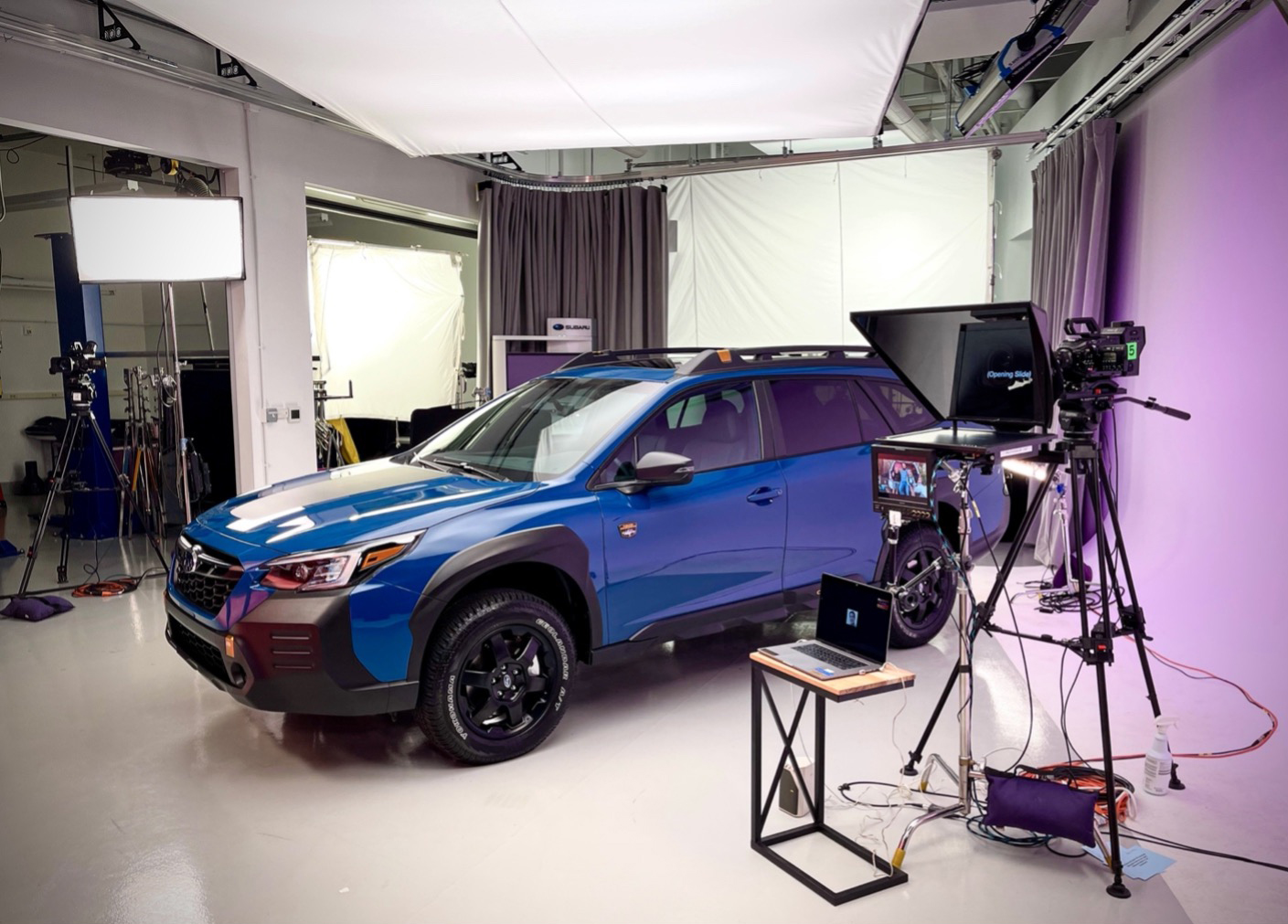How this functioning technical garage became a gleaming new production studio is a story that began when Subaru built its new headquarters in Camden, New Jersey. Subaru National Product Training Manager, Jim Riedel, was intrigued by one of the buildings left behind: a garage that had been used primarily for educational purposes. He decided to call Creative Design Group, Inc., one of Subaru’s strategic partner agencies, and asked its President/CEO, Gary Rivera, to have a look at the space. “It was clear right away that we could do a lot in there,” says Rivera. “We could convert it into a great studio pretty rapidly, with some advanced lighting, new electrical service, acoustic treatments, and a fresh coat of paint.” Riedel shopped the idea to other Subaru departments and his colleagues quickly embraced his vision. “In addition to being able to shoot their new vehicles in a secure space, they loved that their senior executives could also appear more easily in videos and live webcasts with minimal impact to their schedules,” says Rivera.
