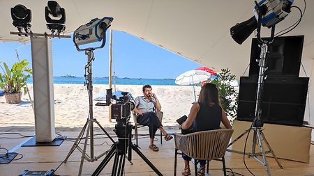DP Giuseppe Truppi doing a video interview on Quinzaine beach, captured by ARRI cameras, Orbiter, and SkyPanel lighting