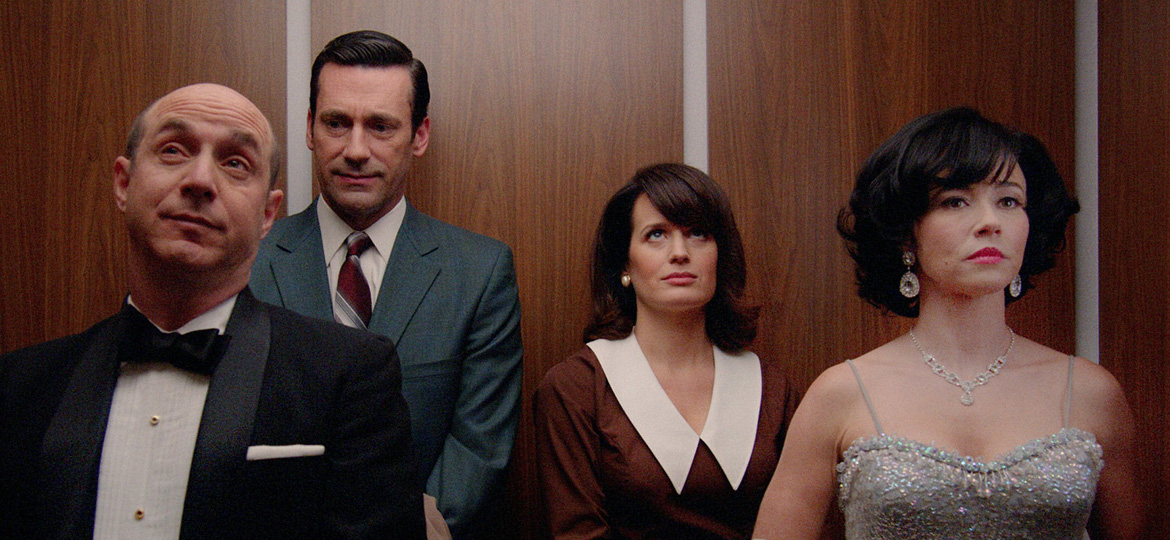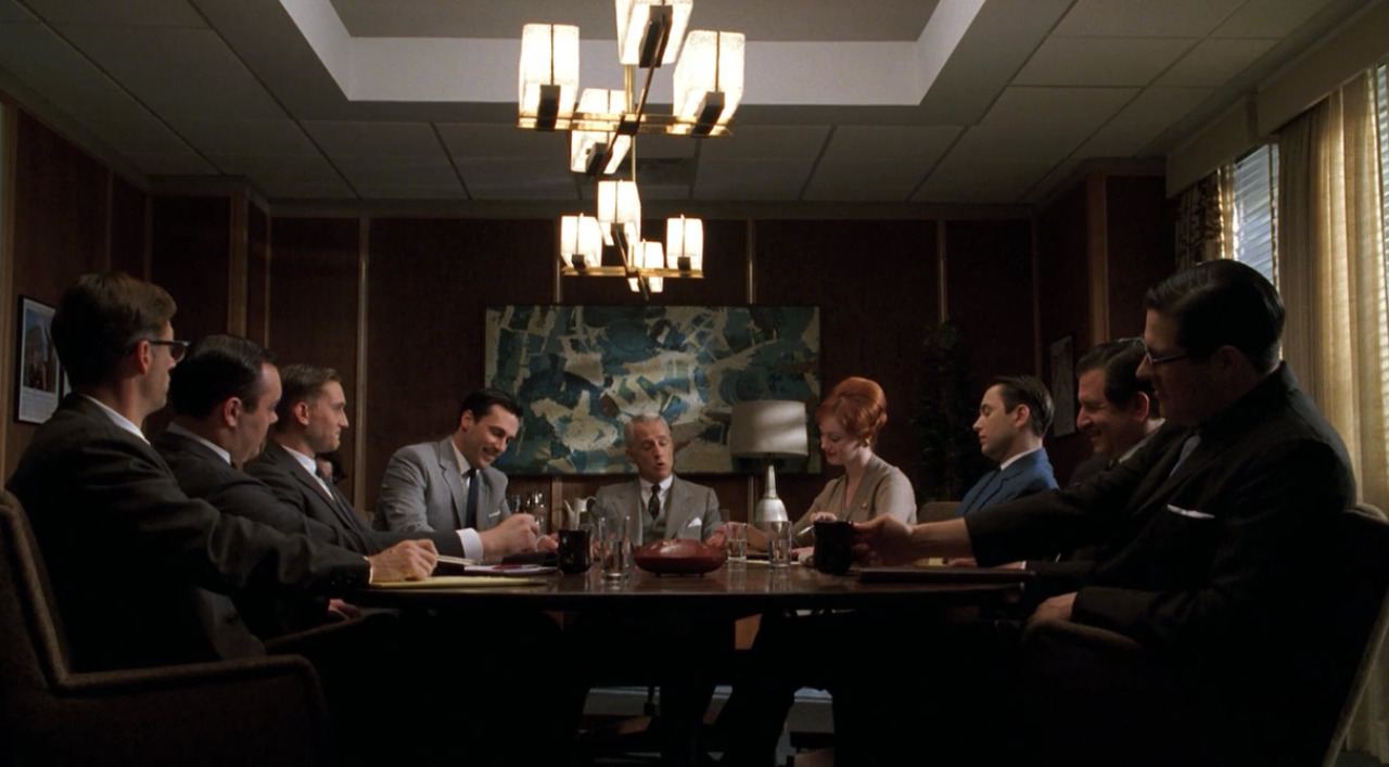 The camera language of the film was set up in season one by Phil Abraham and we more or less adhered to that. They did a lot of low angles, which tends to make the characters look heroic. Also, they liked fluorescents in the ceiling of the office as a compositional element. Before I joined the show, I watched the whole first season in one day. The camera vocabulary they were using was from the period. All the lenses were a moderate range: 25 mm for wide shots, 50 mm for medium and 75 mm for close-ups which weren't even that close, more like MCUs (medium close-ups). They weren't giving anyone haircuts, they kept it pretty loose, which is a very old-fashioned style. I liked that a lot and the whole discipline of it all, because not many television shows did that. They didn't cut very often and they let the shots play out, which I liked very much. These are the reasons why it felt very period. I continued with that when I started and we agreed that we shouldn't move the camera in a way that it could not move in the 1960's, so we never used Steadicam until season six.