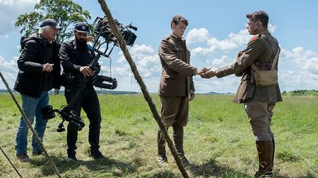 Sir Roger Deakins CBE, ASC, BSC (l.) and TRINITY operator Charlie Rizek on the set of “1917” with actors George MacKay and Richard Madden