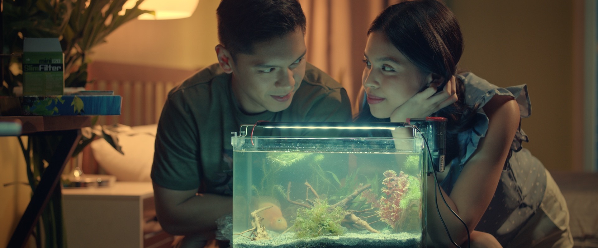“Isa Pa, with Feelings” is a romantic film about a girl, Mara (Maine Mendoza), who meets and falls in love with her deaf neighbor, Gali (Carlo Aquino). Because of the nature of the premise, the film relies heavily on visuals. My director Prime Cruz wanted to use light and water as a visual motif for the film. So, our visual design together with our production designer, Nestor Abrogena, focused mainly on those two elements. We created an aquarium-like world for both the characters as a metaphor to depict how they live in their own worlds and how they try to come out of their state of isolation.