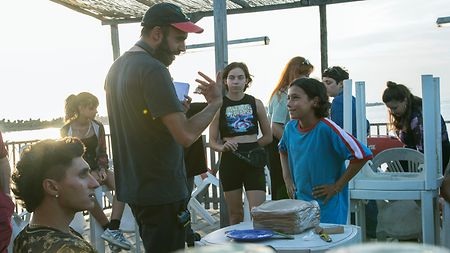 Definitely the one scene with the light at the turn of dusk and night in which the two main characters arrive at a little bar on the shoreline where there is dancing. It was a four-minute long take to be completed in the 15 to 20 minutes during which the light was good. In this scene, the kids arrive on motorcycles and ride up to a fishing platform on which the bar is located. We shot three takes back to back and it was complicated because of the interactions with the figures and because of the crane, which was lowered to coincide with the arrival of the motorcycle. From there, the camera was caught on the fly and moved by hand to follow the two figures, go up with them, and immerse itself in the party.