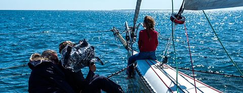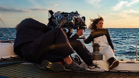 Finalement, les plans sur le bateau se sont révélés plus simples à tourner que je ne le pensais. Avant le tournage proprement dit, nous sommes partis faire des essais en mer avec le trimaran pour voir comment nous allions nous débrouiller. Au final, j’ai vu qu’en travaillant à l’épaule avec l’ALEXA Mini LF, j’avais beaucoup de souplesse pour me déplacer sur le bateau. Le trimaran mesure quinze mètres de large et il y a des filets entre les flotteurs sur lesquels je pouvais marcher. Cela m’a permis d’avoir des angles de prises de vues très différents, des positions de caméra variées. En fait, ce type de bateau est assez stable en mer, comparé à un monocoque. Bien sûr, quand ça file à pleine vitesse, ça va très vite, mais les mouvements sont moins prononcés que sur d’autres types de navires. À l’épaule, j’arrivai à faire des plans qui gardaient une forme d’instabilité, mais sans aller jusqu’à mettre en danger l’image. Cette instabilité créait même une dynamique, un mouvement très intéressant au récit.